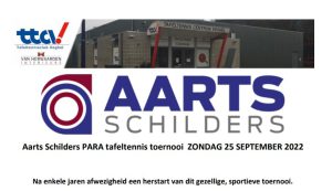 Aarts Schilders PARA tafeltennis toernooi ZONDAG 25 SEPTEMBER 2022 30 aug 2022 Uitnodiging, klik! Inschrijfformulier, klik! Routebeschrijving, klik!
